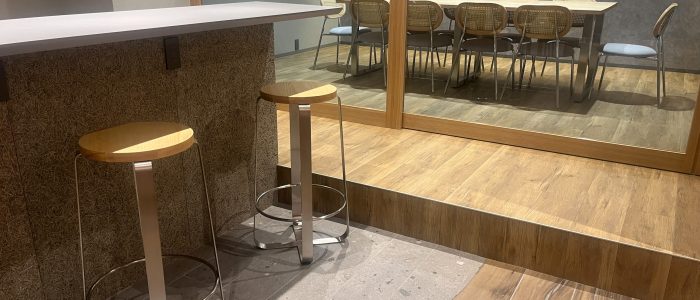 色調としてはグレーと木目調のツートーンとし、執務空間としての落ち着きとイベント空間としての華やかさを両立しました。