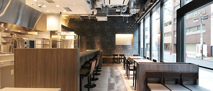 「うどん魂 侍-SAMURAI-」という店舗名は、インバウンドに親しみを感じてもらう新ブランドとして命名されました。店内の内装や石畳を歩いているかのような床に和のテイストを感じてもらいながらも、全体的に落ち着いた配色にすることで従来のうどん屋さんにはない雰囲気を創出しました。