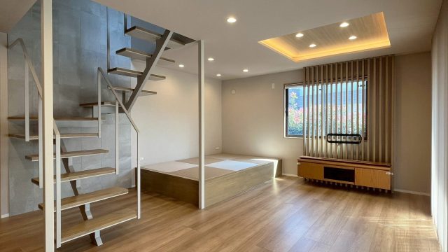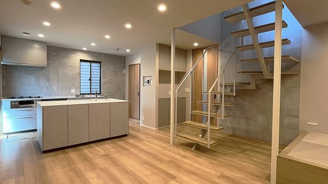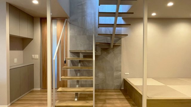 建売住宅のリノベーションです。改修前の階段は階段下の収納と間仕切でリビング空間を分断していました。その階段を「力桁まわり階段」に改修することで空間に広がりをもたせました。また背面には縦方向のタイルを張り、2階とのつながりを強調させています。