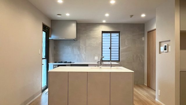 奥様こだわりのキッチン背面にも同じタイルを張り、リビング全体でグレーとベージュが調和する空間を目指しました。